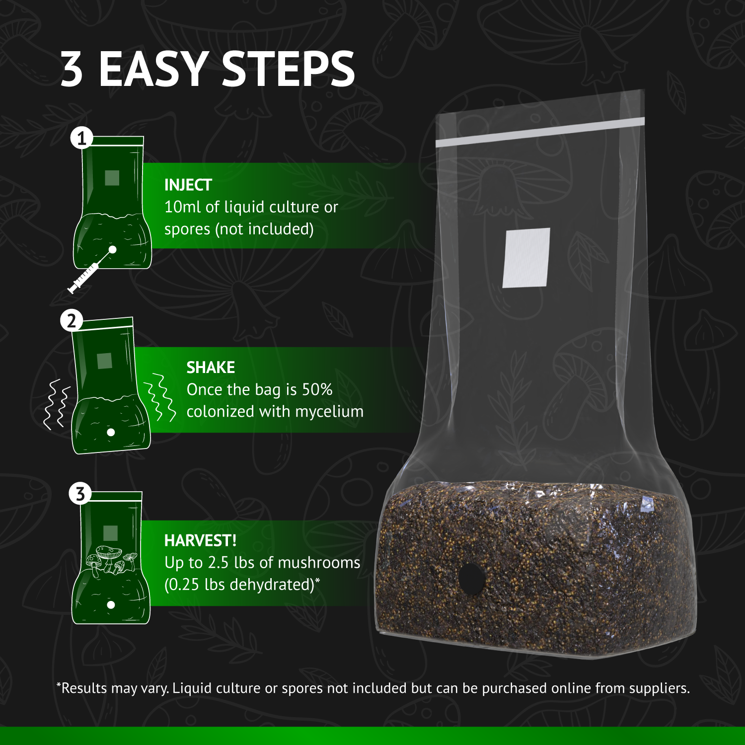 Inject your live culture or spores into this prepared bag, when the mycelium grows throughout the bag completely, open the top of the bag and place in fruiting conditions.Â